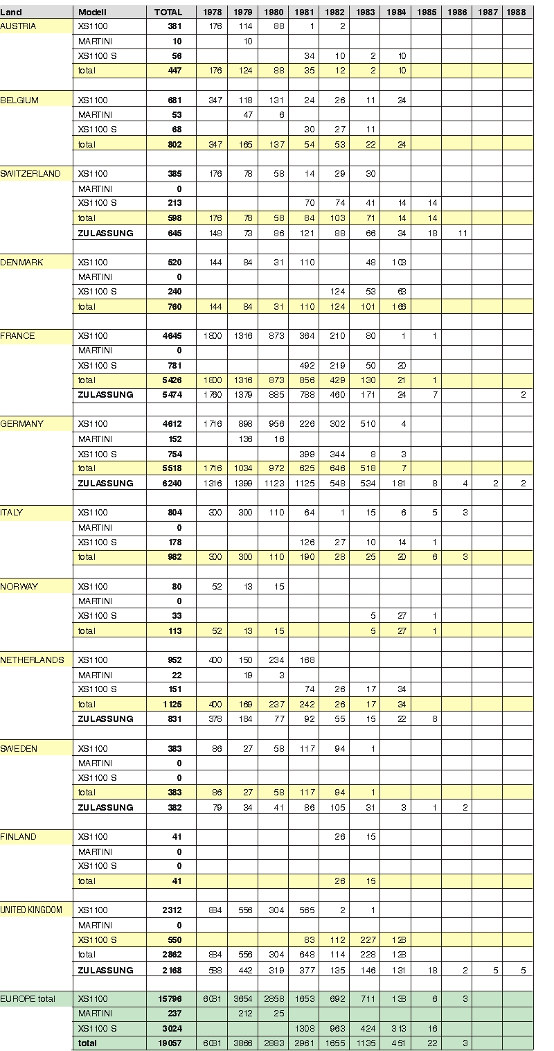 Official sales numbers of the XS 1100 in Europe between 1978 and 1988 total = Numbers of sales by dealers ZULASSUNG = The numbers in this line tells you, how much of the XS are registered in this country The difference between total and ZULASSUNG come into beeing because many of the XS are sold from the dealer to somebody from an other country.